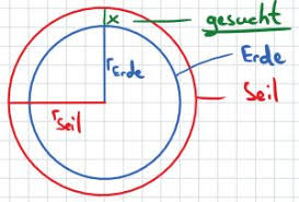 - Ein 40000 km langes Seil, das am Äquator straff um die Erde gespannt war, wird geringfügig um 1m verlängert und so gestrafft, dass der Abstand von der Erde überall gleich ist. Kannst du jetzt unter diesem Seil hindurchkriechen?